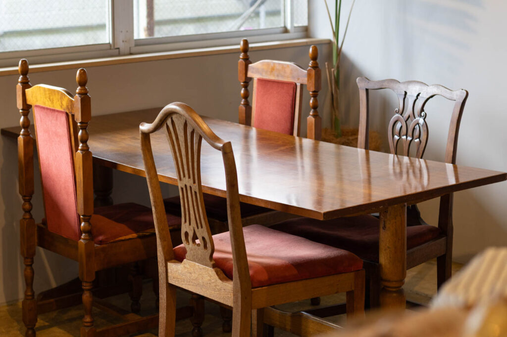 扉を開けると、グレーの壁に木製の椅子やテーブル、植物の緑が映える洗練された空間が広がります。