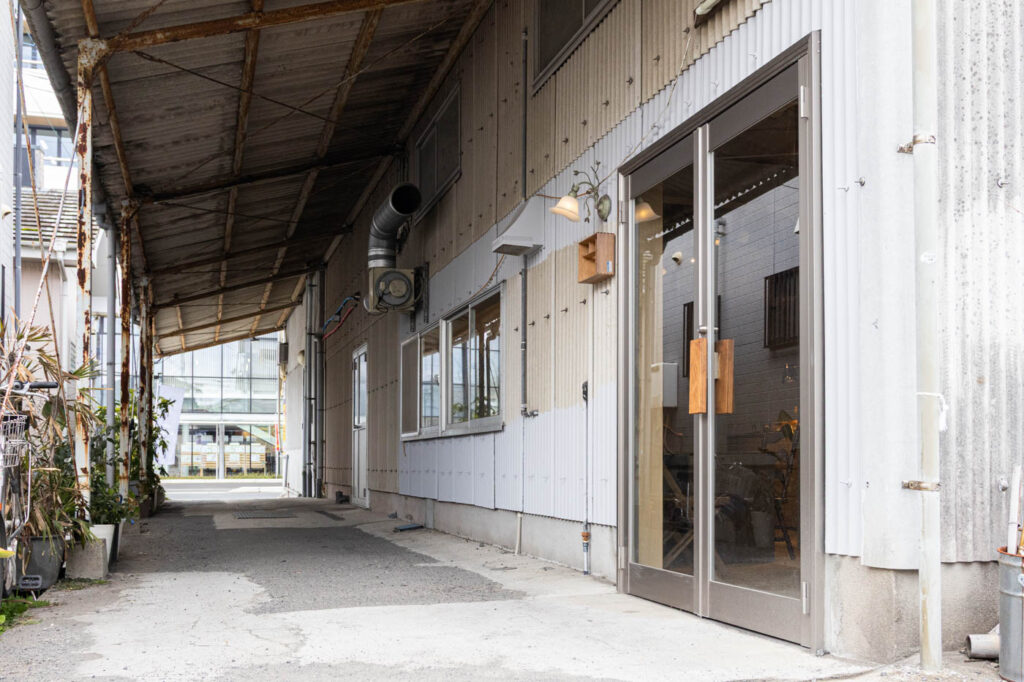 倉庫をリノベーションした店舗は、当時の面影を残した、トタン壁の無骨なたたずまい。窓や扉からは暖色のやわらかな灯りがこぼれ、外からでもあたたかな空気が感じられます。