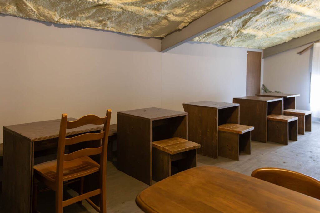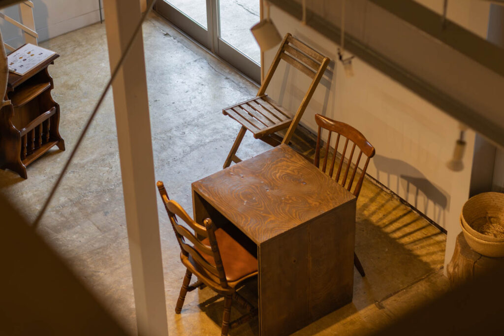 吹き抜けのある1階には、2~4人掛けのテーブルが並び、その奥にはふかふかのソファーがある個室も用意されています。2階の天井は少し低めで、まるで秘密基地のよう。程よいこもり感があり、ついつい時間を忘れて長居したくなります。