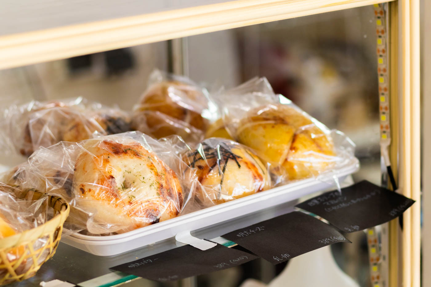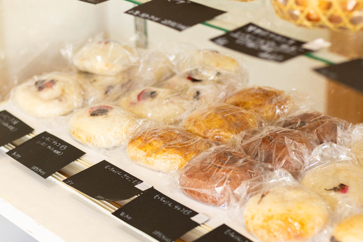 同店のベーグルの中でも、さらにやわらかく、“もっちゅり”とした食感が特徴のシリーズも。生地をお餅に見立てて、きな粉をまぶしたり、チョコレートを練り込んだり、中にあんこを入れたりと、さまざまなアレンジが並びます。