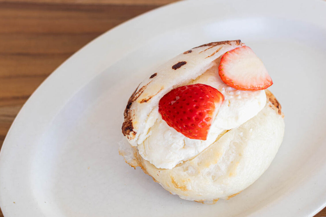 食べた瞬間、なめらかなクリームチーズと白あん、フレッシュなイチゴのみずみずしさが口の中に広がり、塩みと酸味、甘みが絶妙に調和します。ベーグルの表面には、ココアパウダーを使って描いたというネコちゃんの顔が。思わず手に取ってしまう、愛らしい一品です。