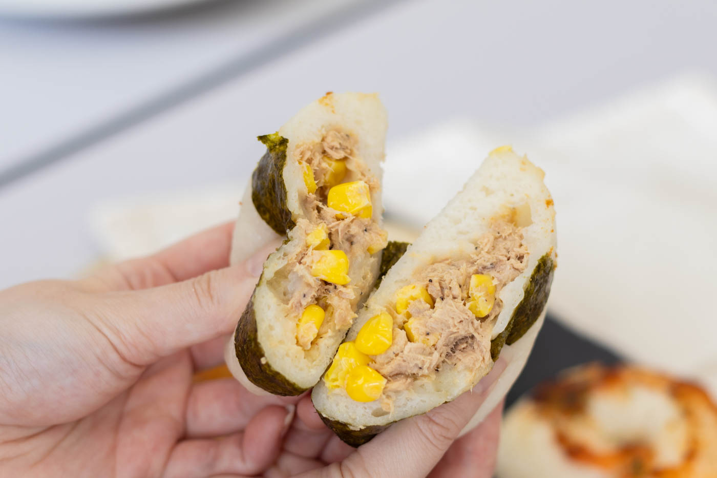 店内のショーケースでひときわ目を引く、おにぎり型の「ツナコーンマヨ」。ぷにっとした生地の中には、自家製マヨネーズで和えたツナとコーンがぎっしりと詰まっていて、一口頬張ると具材の多さに思わず笑顔がこぼれます。