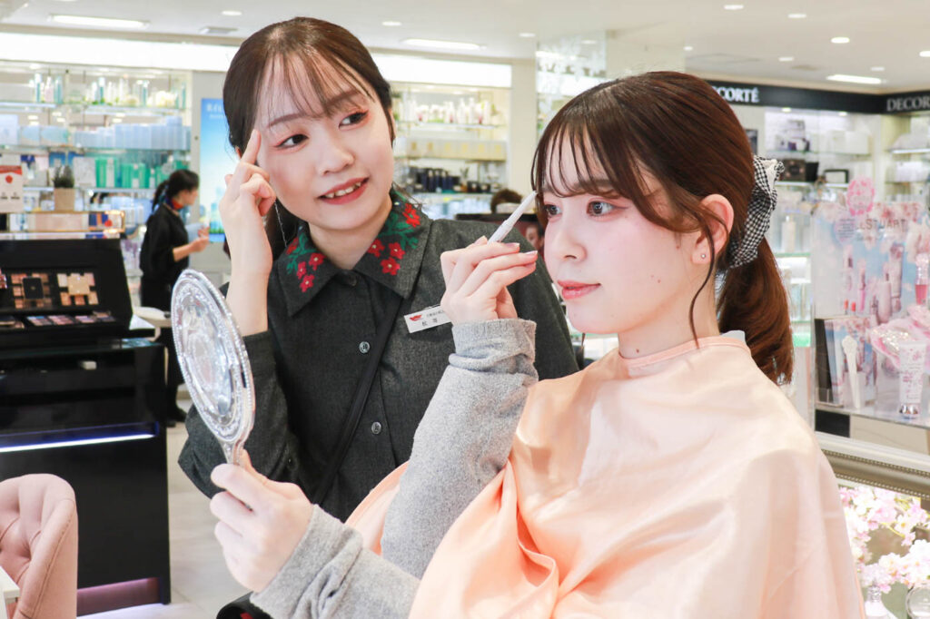 対面での接客を大切にしており、豊富な専門知識を持つスタッフが、一人ひとりの肌悩みや理想の仕上がりに合わせて丁寧に提案。初めて化粧品を選ぶフレッシャーズから、美容にこだわりたい人まで、幅広く利用されており、親子3世代で通う人もいるなど、長年にわたり多くの人に親しまれています。