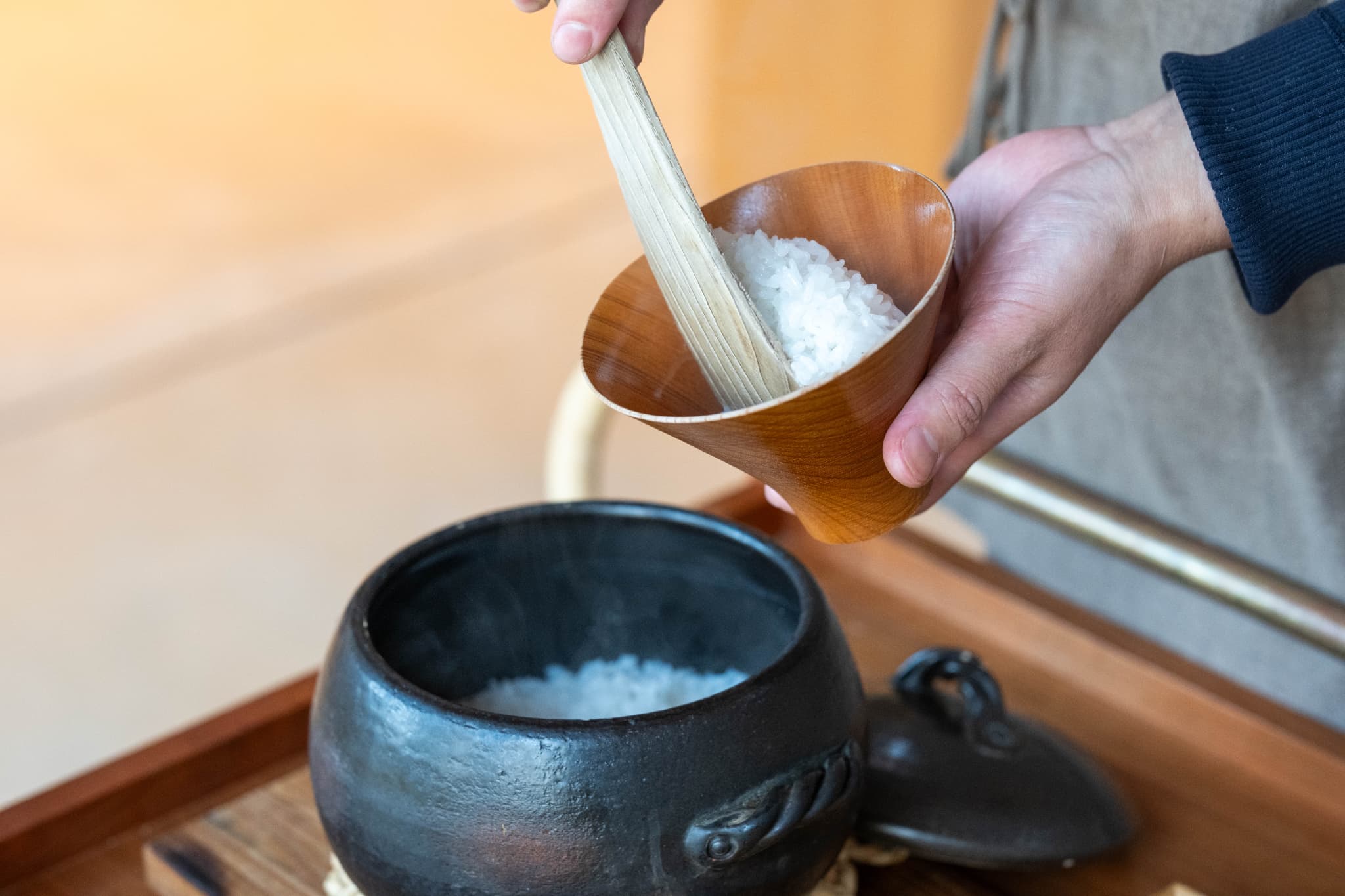 ▲土鍋で炊かれたご飯を、お椀によそっていただきます