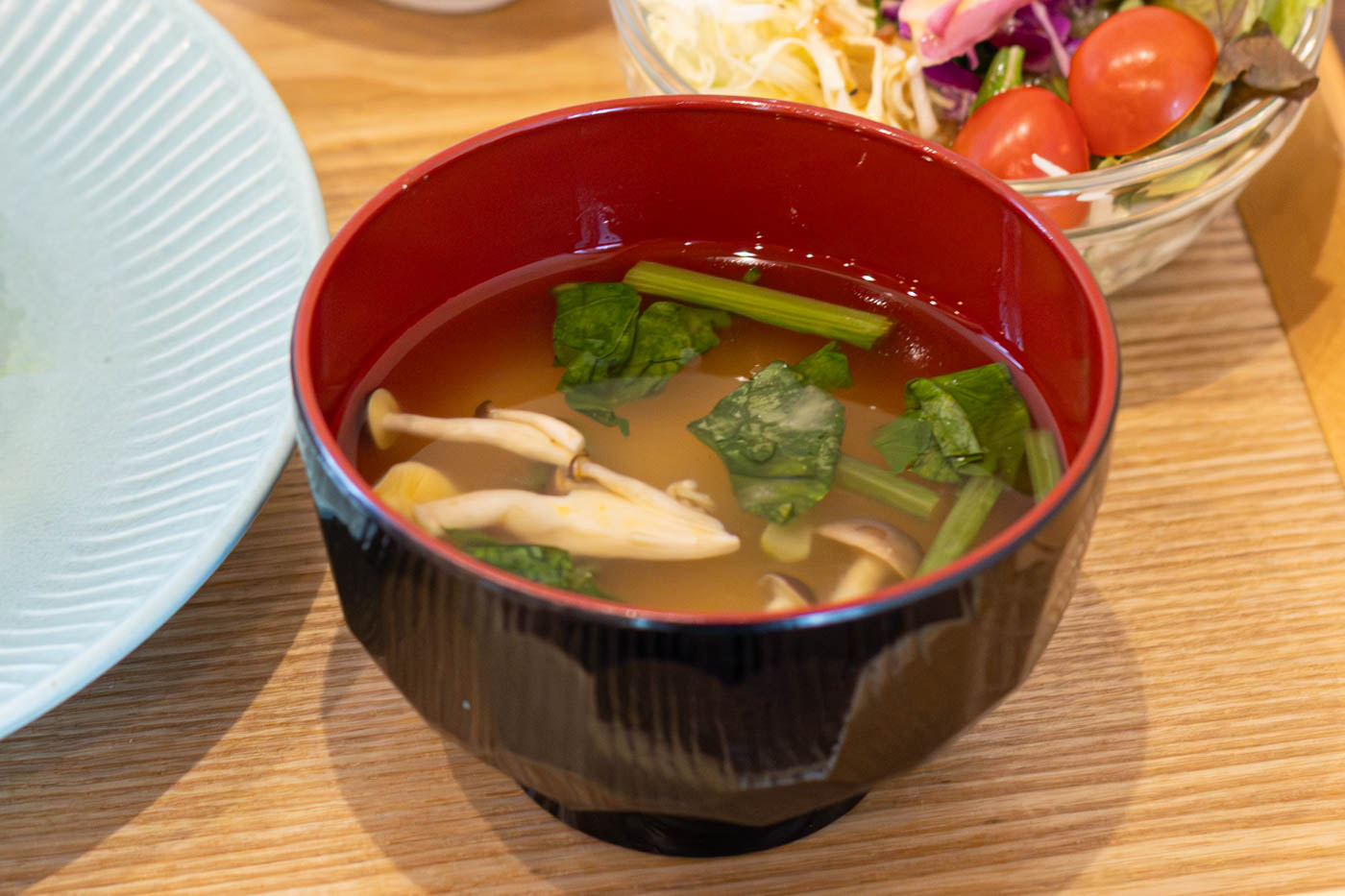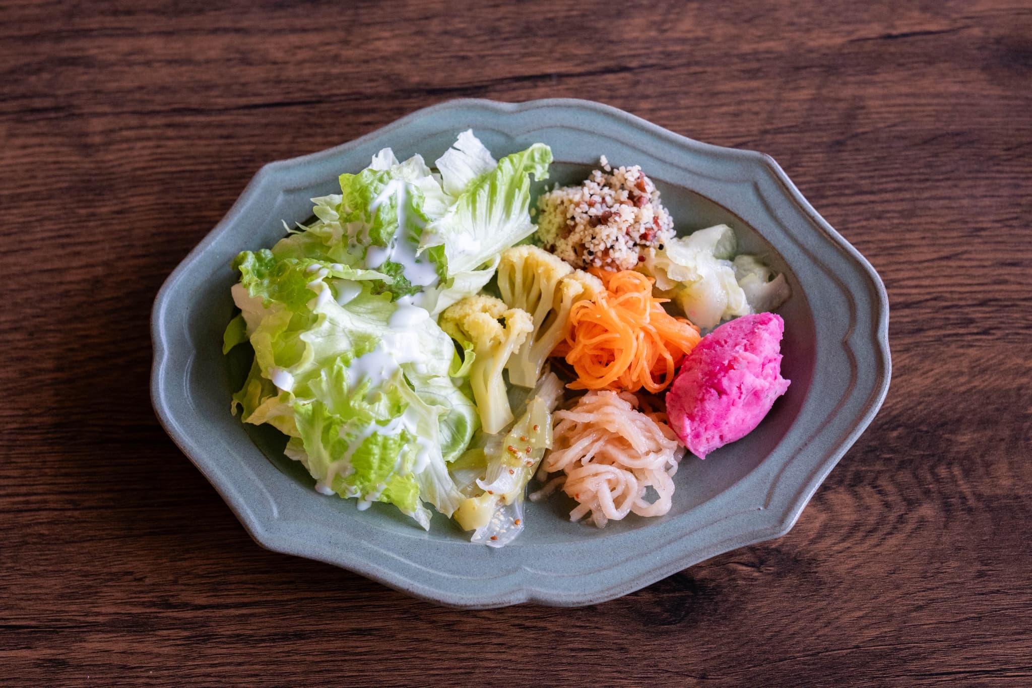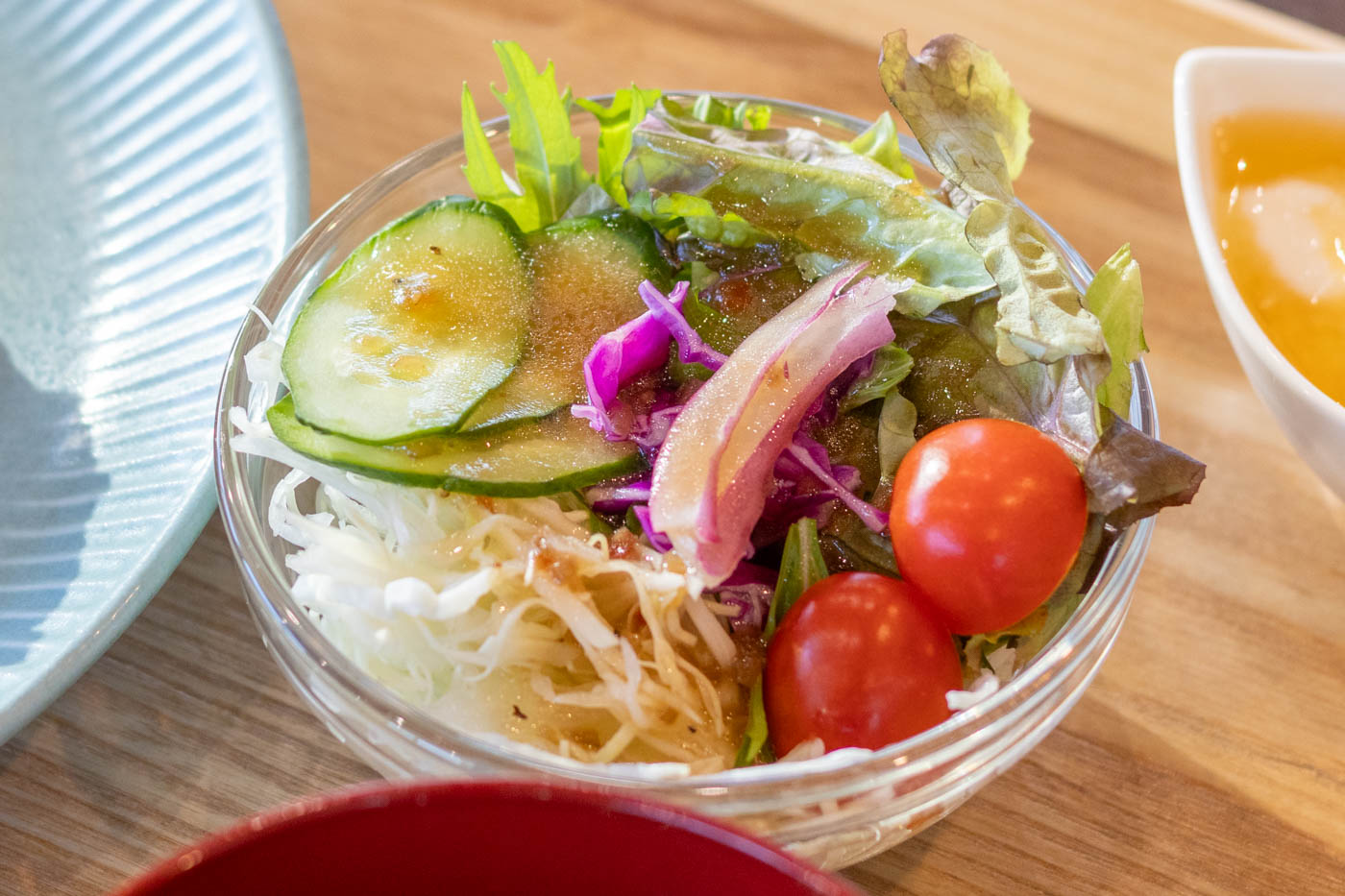 ランチメニューは全部で3種類。月替わりでメイン料理が変わる「Bランチ」は、サラダ、みそ汁、プチデザート、ドリンクのセット。取材時は、旬の揚げ野菜が彩りを添えたキーマカレーでした。そのほか、手ごねハンバーグの「Aランチ」と、1日10食限定の「週替わりランチ」もあります。どちらもメイン料理にご飯、みそ汁、サラダ、小鉢2品、プチデザート、ドリンクが付いたセット。全てのメニューの塩分量やカロリーを、1日の摂取目安の3分の1ほどに調整しているほか、メニュー表にもカロリーと塩分量が書かれているため、ダイエット中の人や塩分が気になる人も気軽に注文できます。