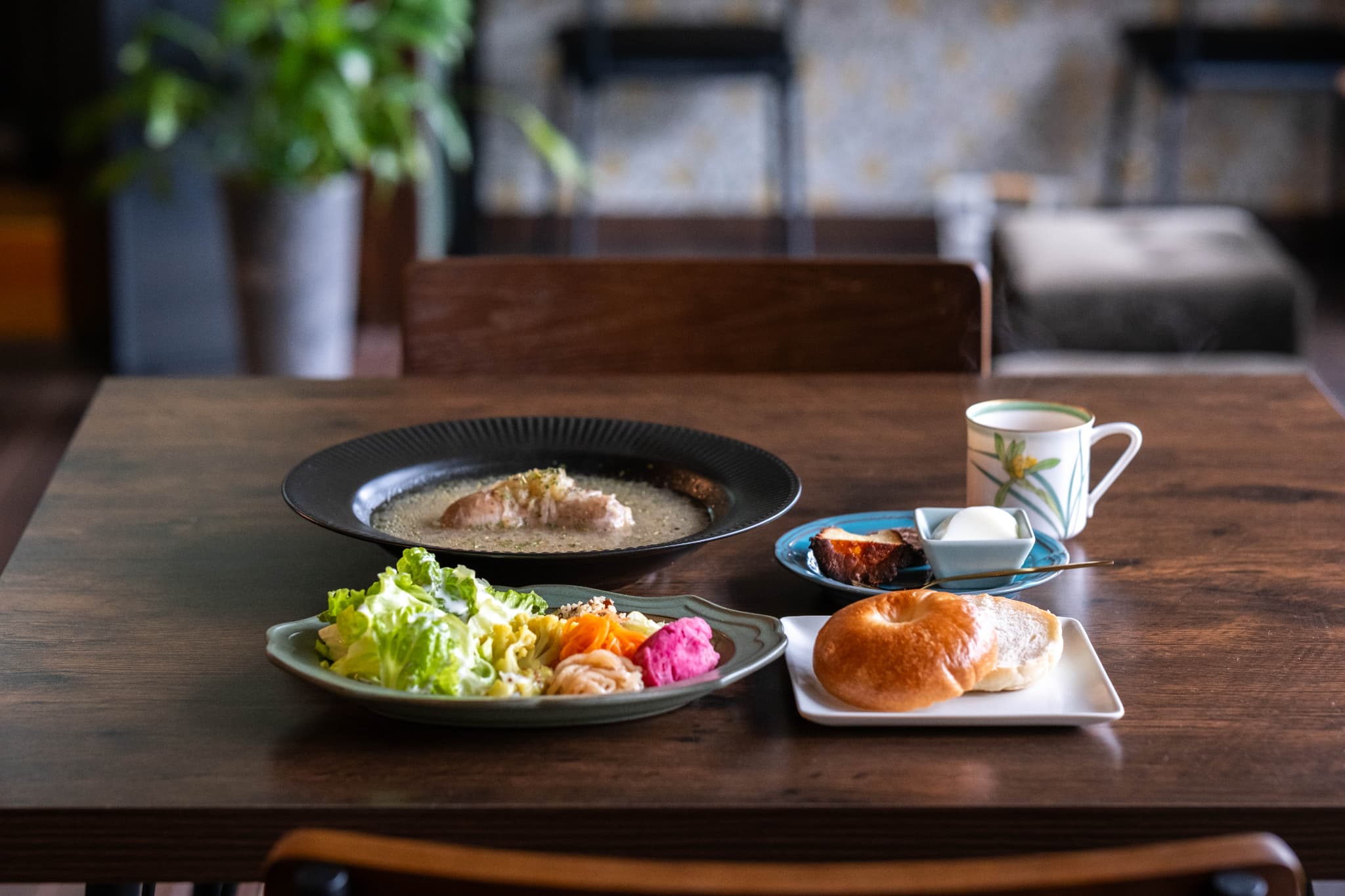 11時から14時に楽しめるランチは、「おまかせベーグルランチ」と「オープンサンドランチ」の2種類。有機野菜を育てている農家さんが多く、ちょっと珍しい食材も手に入る蒲生ならではの、新鮮な食材をふんだんに使った料理が味わえます。「おまかせベーグルランチ」は、毎日10食限定のメニュー。週替わりのメインに、旬の野菜を使ったサラダ、選べるベーグル、デザート、ドリンクがセットになっています。「オープンサンドランチ」は、横半分にカットしたベーグルに、たっぷりの具材が盛り付けられた一皿。“しょっぱい”と“甘い”のバランスが絶妙で、交互に食べたくなるおいしさです。