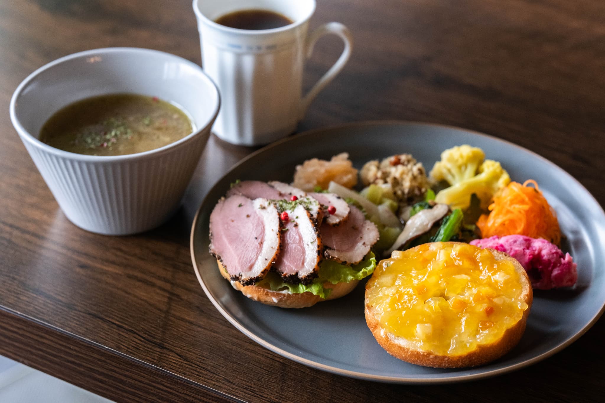 11時から15時に楽しめるブランチメニューは「ハンバーグプレート」と「イギリスパンの焼きサンドイッチプレート」の2種類があります。「ハンバーグプレート」は、店内仕込みの和牛100%ハンバーグやキッシュ、サラダ、パンのワンプレートに、季節のスープやデザートが付いたセット。デザートは、季節のパルフェかイタリアンジェラートが選べ、その日の気分や食べたい量に合わせて選べるのもうれしいポイントです。