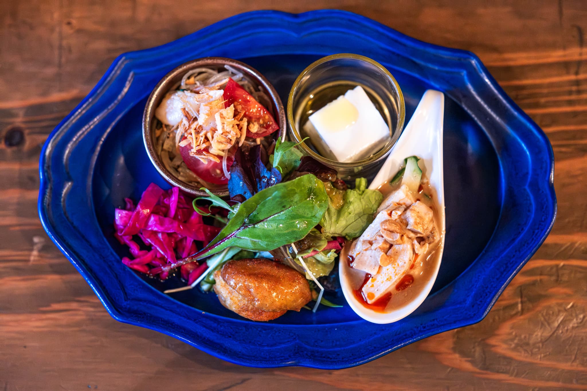 ▲この日の前菜は、レッドキャベツやじゃがいも豆富、棒棒鶏、はるさめサラダ、ジャガイモのフリット、サラダの6品