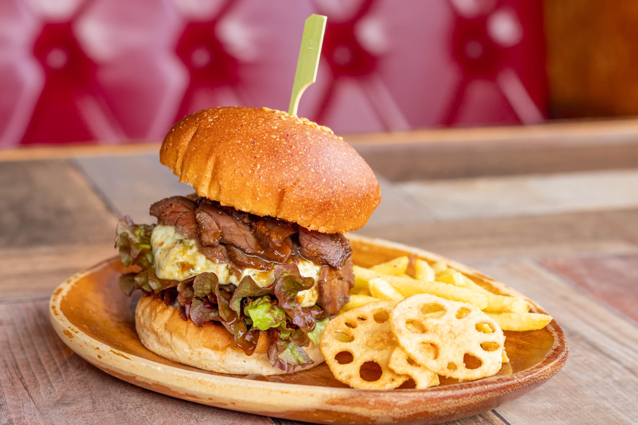 看板メニューの「ダンテバーガー」は、姶良市のソウルフード・あご肉が主役。豚の顔周りの部位であるあご肉は、コリコリとした食感で食べ応え抜群!やわらかく、脂身の少ないこめかみの肉を一口サイズにカットし、ニンニクの効いた甘辛ソースに絡めています。加えて、塩コショウでシンプルに味付けした、粗めの合いびき肉のパティも一緒にサンド。そこにチェダーチーズとサニーレタスも加わり、味と食感ともにバランスの取れた満足感のある一品です。そのほか、店長おすすめの「わさびとローストビーフバーガー」や、「アボカドバーガー」、「プレミアムシュリンプバーガー」などの多彩なハンバーガーをはじめ、あご肉を使ったカレーやライスプレートもそろいます。