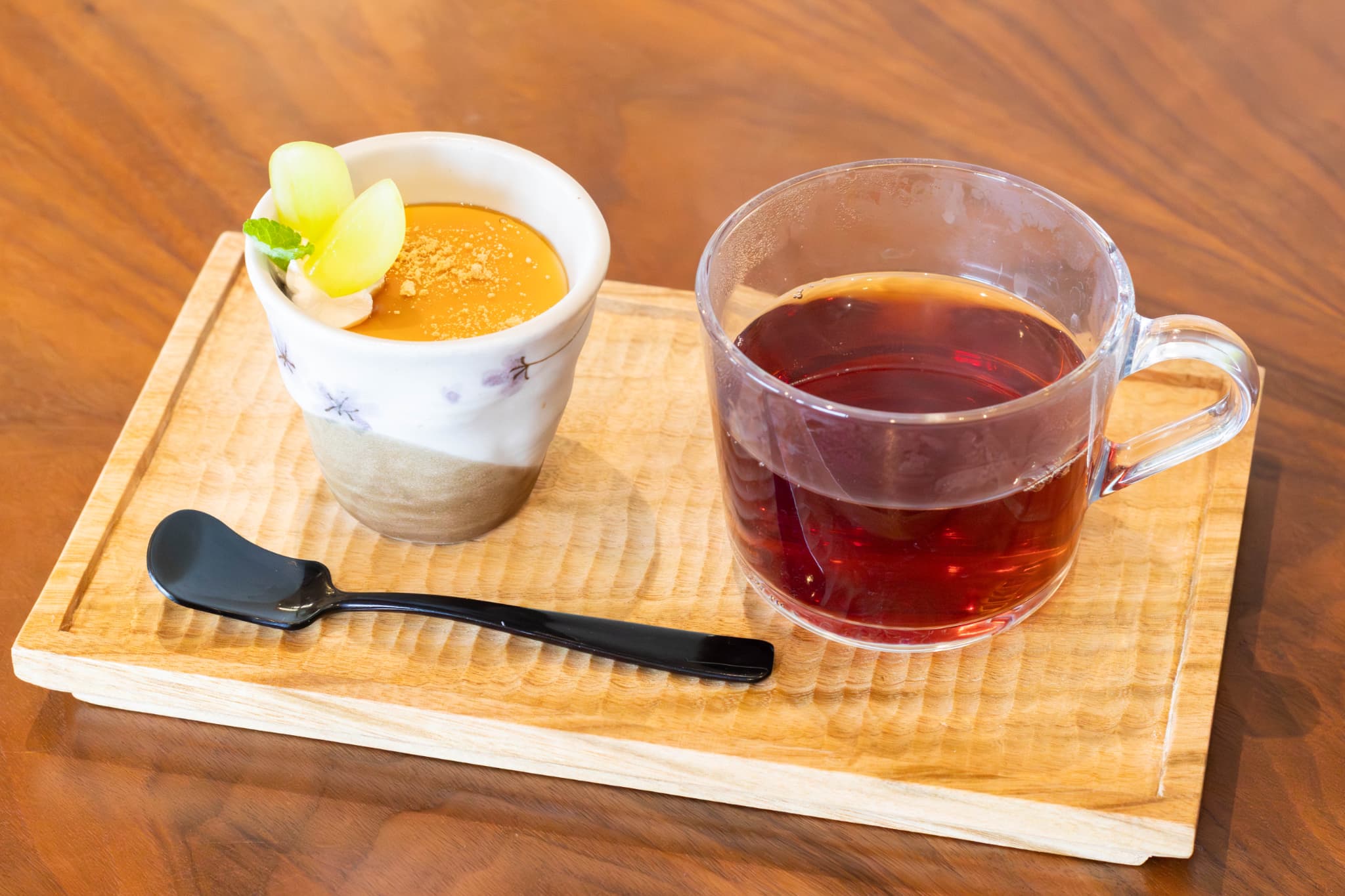▲左)「黒蜜きなこのパンナコッタ」、右)「紅茶(ホット)」