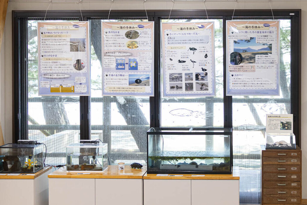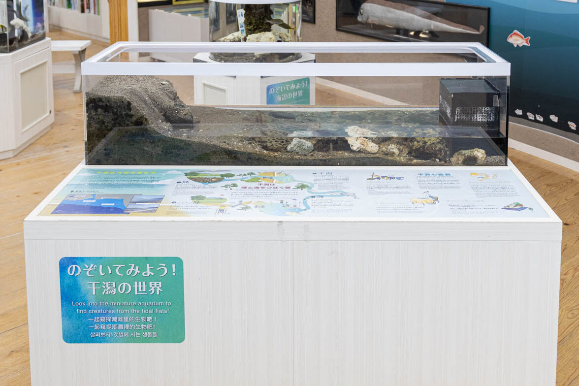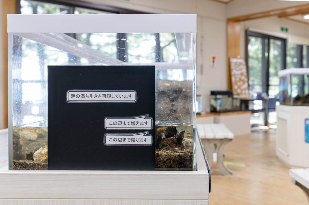 干潟の生き物が飼育されている水槽は、潮の満ち引きを再現する仕組みが備わっています。