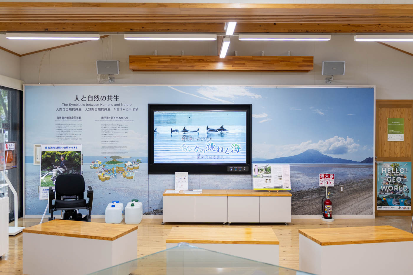 また、錦江湾の自然と私たちのつながりや、環境保全活動についての動画も上映。イルカやウミガメ、渡り鳥のクロツラヘラサギに焦点を当てた、5~6分ほどの動画が見られます。