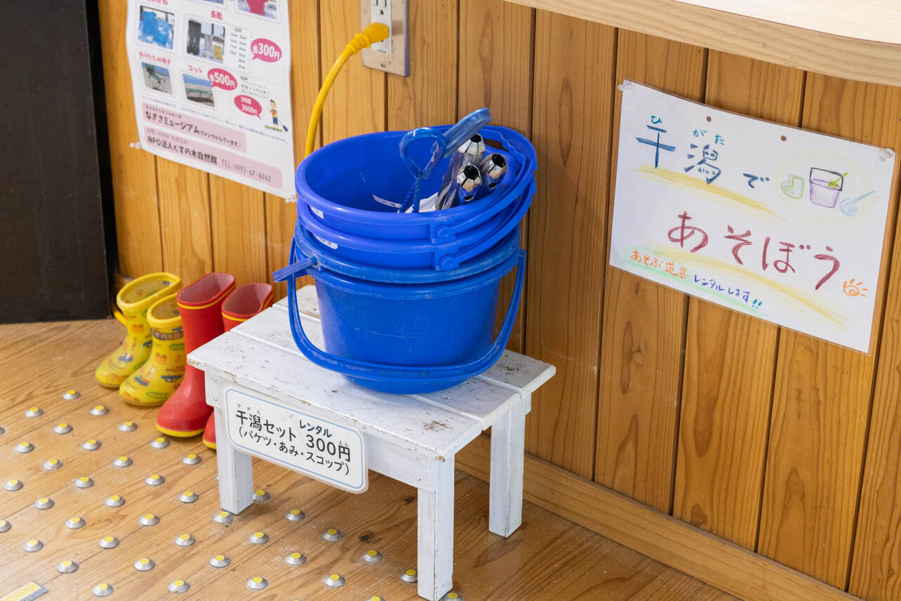 館内では、有料で長靴やバケツ、スコップなどの貸し出しも行っており、手ぶらでも散策や観察ができます。干潟は干潮時にしか現れないので、訪れる前に時間を調べておくと安心です。