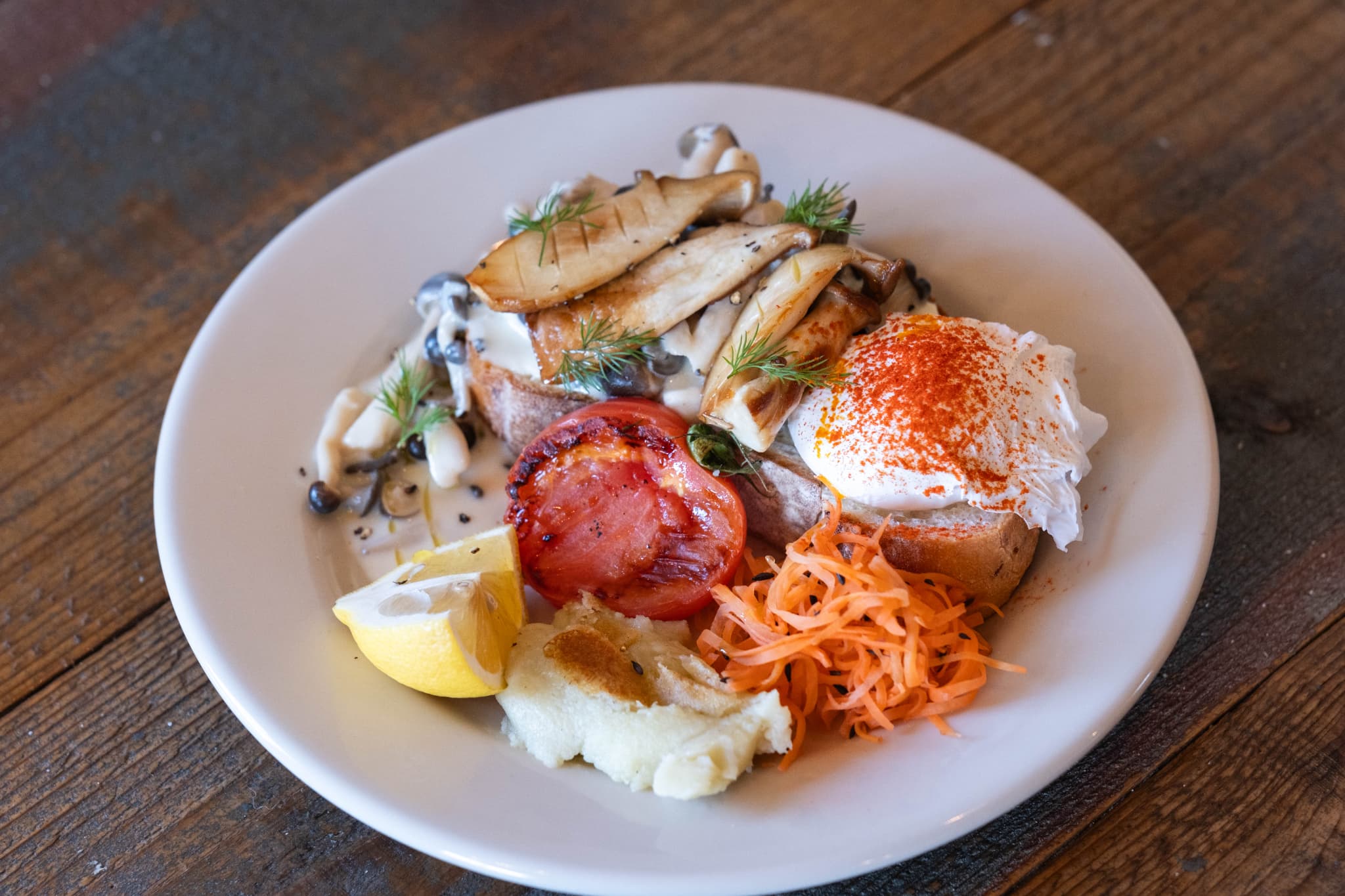 朝は本場の雰囲気を楽しめるオープンサンドを提供。オーストラリアの定番朝食「スマッシュアボカド」は、ライ麦パンの上に、アボカド、ポーチドエッグ、サラダがのったボリュームのある一品です。食材のフレッシュなおいしさを引き立てるのが、仕上げにかけられている自家製のミックススパイス〝デュカ〟。砕いたナッツと数種類のスパイスをブレンドした、オーストラリアで親しまれているエジプトのスパイスです。爽やかな香りとザクザクとした食感がいいアクセントに!また、付け合わせのマッシュドポテトやピーナッツバターソースと一緒に味わうと、新たな味わいも楽しめますよ。ランチには「季節のスープ」が付きます。