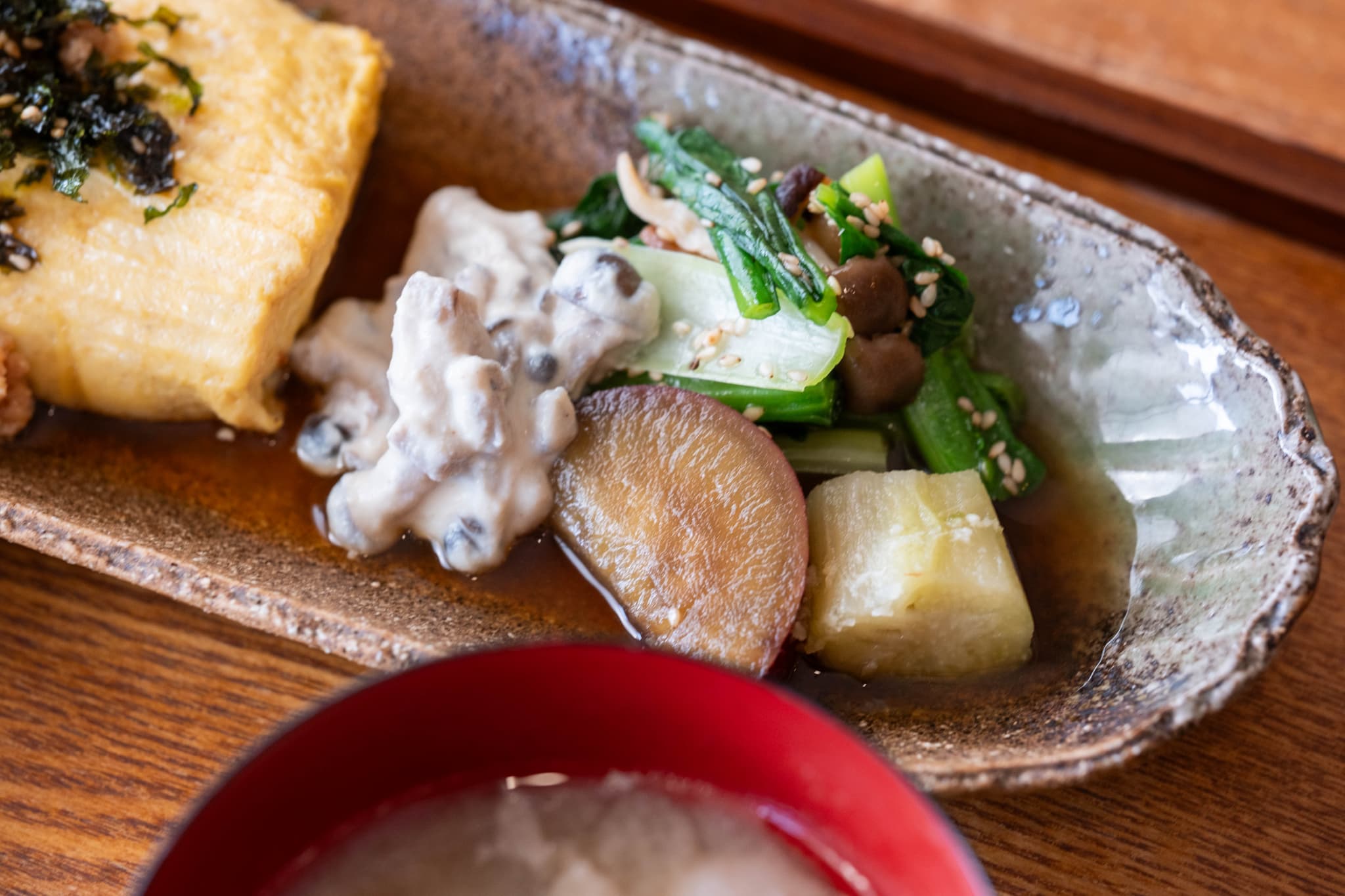さつま町の専業農家から直接仕入れる米は、羽釜で炊くことでふっくらつやつや、噛むほどに甘みも広がります。玄米は、にがりを加えて圧力鍋で炊き上げ、もちもちの食感。甘みとほのかな塩みも感じられます。お汁は旬の野菜が約10種類と具だくさん。自家製麦味噌の豊かな風味と野菜の旨みが溶け合った、心温まる優しい味わいです。