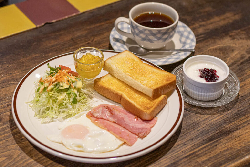 モーニングでは定番のバタートーストをはじめ、はちみつトーストやあんホイップトーストなど、甘いメニューも充実。中でも人気は、アニメ映画にも登場する「ラピュタトースト」。厚切りのトーストに粒マスタードとマヨネーズを塗り、ベーコンと半熟目玉焼きをのせています。ナイフを入れると、黄身がとろ~り!思わず声が出てしまう、至福の瞬間です。