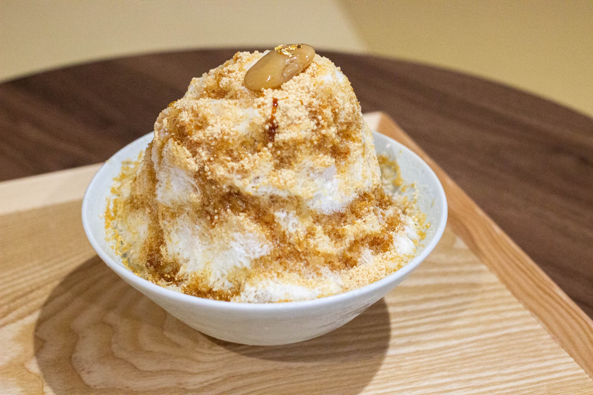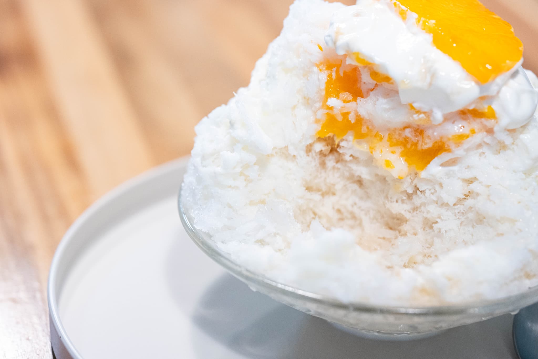 昔は、小豆をのせた氷の上に、牛乳をかけるというシンプルな食べ方が主流だったそう。ここでは、練乳とハチミツがかかったパッピンスに、お好みで牛乳をかけていただきます。
