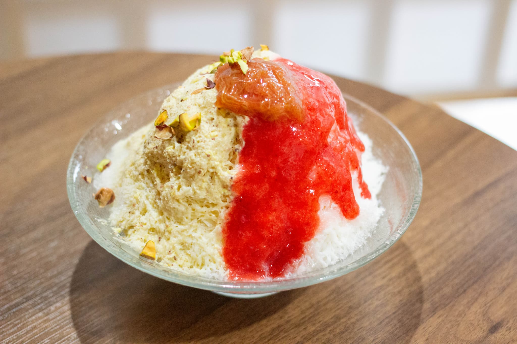 「ジャリジャリきなこ」は、練乳・きなこ・黒蜜がかかった氷の上に、白花豆をのせたかき氷。口に入れると氷がすっと溶け、きなこの香りと食感が残り、最後まで余韻が楽しめます。さらに氷の中には、バニラアイスと白花豆が隠れており、味と食感の変化を最後まで飽きずに食べられるのが魅力です。「苺とピスタチオ」は、ピスタチオソースと果肉たっぷりの自家製いちごソースを合わせた贅沢なかき氷。