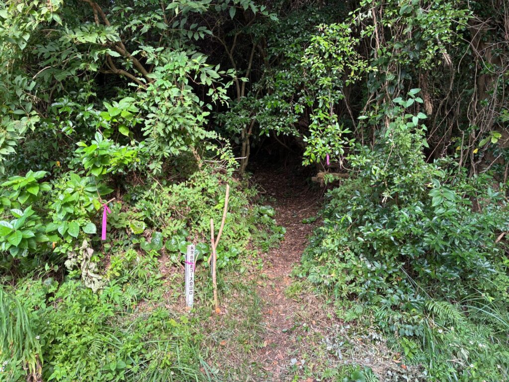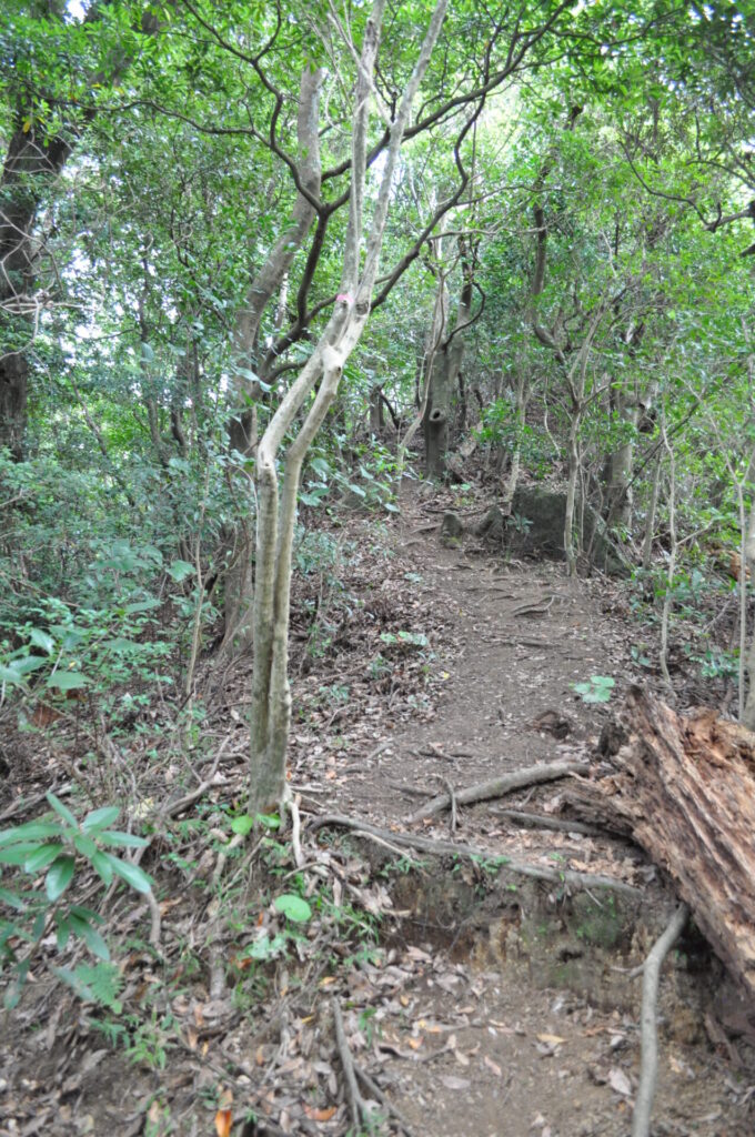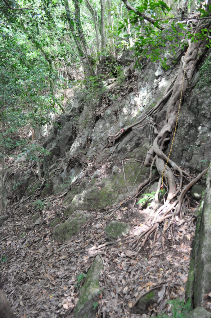 西郷ドン岩は、縦走コース登山口から登り始めて約30分です。たったこれだけの距離でも、もう汗だくに。岩にもたれかかりながら、水分とチョコレートを補給して一休み。西郷ドン岩に背中を押されるように歩き出し、斜面を慎重に渡り切り、えーっと次は…と、ピンクのリボンテープや赤いテープを目印にコース難関の岩場へ。