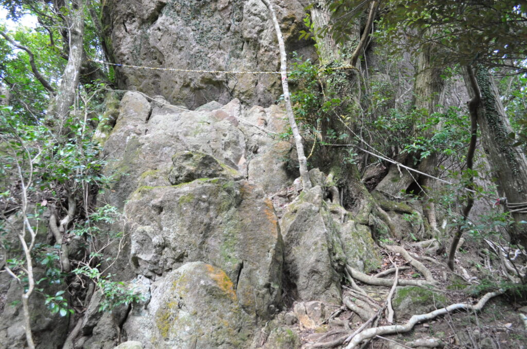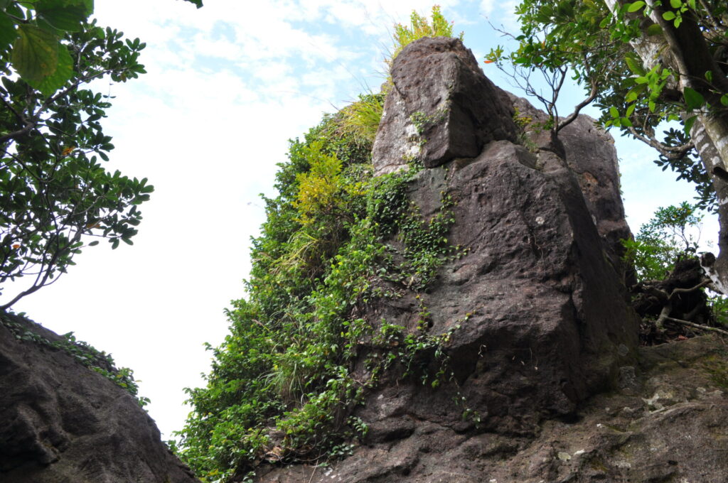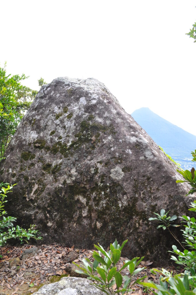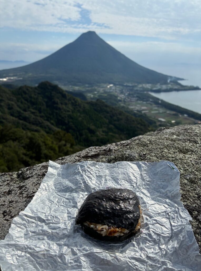 山頂近くの標高333m地点には「開聞岩」と呼ばれる岩があります。背後に見える開聞岳とそっくり。海苔でも巻いてパクッと食べたくなるような三角おにぎり形の岩です。山と岩、この2つのシルエットの見事なコラボレーションを写真に収めた瞬間、疲れも一気に飛んでいきました。