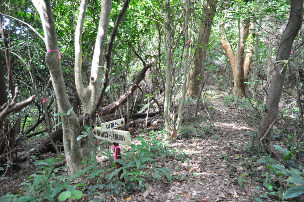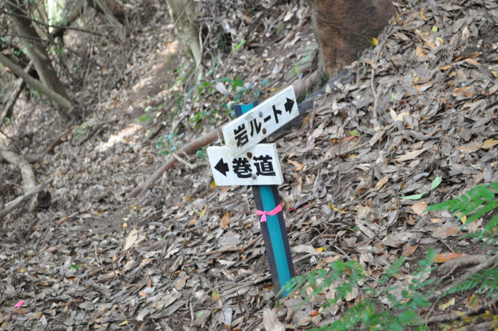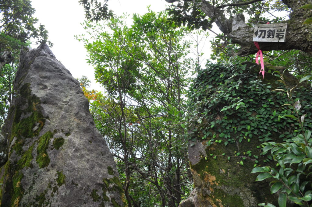 「刀剣岩」を過ぎると、ルート選択の標識が現れました。「岩ルート」それとも「巻道」? 聞かれるまでもなく、安全優先で巻道を選択しました。巻道でも、岩を巻くようにロープが張られています。しかも、横たわる大きな倒木も乗り越えるには、ロープを持つ手を途中で変えながら、念仏のように「三点確保」と唱えながら進みました。ここを過ぎると、後は細尾根を行くのみ。冒頭で触れた「開聞岩」を過ぎると山頂です。頂上で開聞岳におにぎりをお供えして下山の無事をお願いしました。