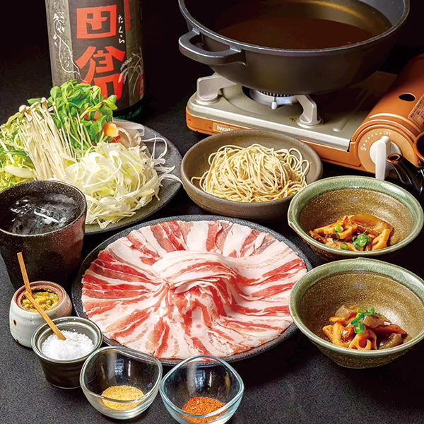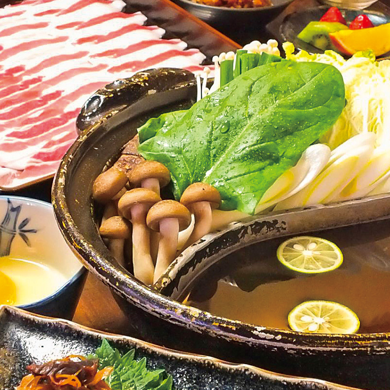 スープが8種類から選べる「黒豚しゃぶ鍋」や郷土料理、焼酎が楽しめます。